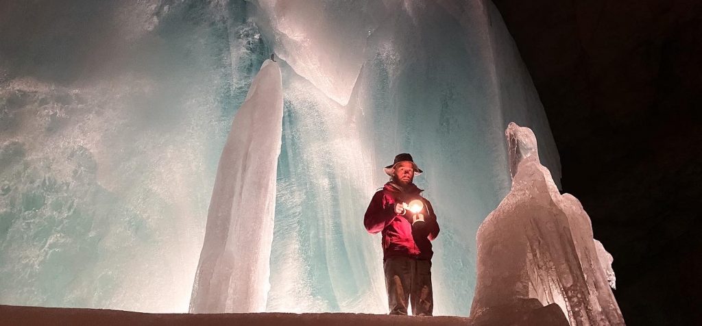 Mit durchgehend 0 Grad wurde es ab dort kühl. Es ging in den Berg hinein. Die Führung führte über 1400 Treppenstufen durchs Eis. Über uns 400 Meter Berg. Als Beleuchtung gab es nur kleine Karbidlampen und Magnesiumlicht.