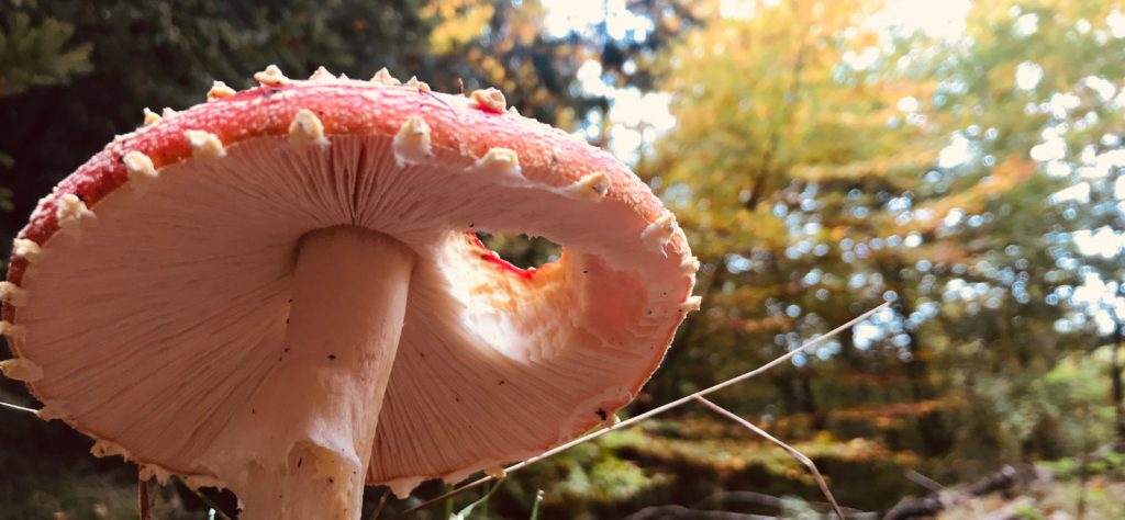 Es gibt im Rhein-Taunus Naturpark verschiedene Routen, die mehr oder weniger befestigte Wege enthalten. Wir sind – natürlich – erstmal keine dieser Routen gegangen. Das schöne ist hier nämlich, dass es abseits der ausgeschilderten Wege auch viele weitere Wege gibt. Diese sind so 2-3 Meter breit und reiner Waldboden, ohne künstlich angelegten Schotter oder ähnlichem. Die Natur im Herbst ist, für mich, vermutlich die Schönste. Die Bäume bekleiden sich mit Moos, manche sehen wirklich aus, als würden sie sich etwas anziehen. Unzählige verschiedene Grün- und Brauntöne, mittendrin rote, weiße und gelbe Flecken – Pilze. Gerade wenn es geregnet hat, erhalten alle Farben zusätzliche Brillianz. Einfach unfassbar schön. Leider habe ich überhaupt keine Ahnung von Pilzen und würde deshalb auch keine sammeln, aber ich finde es absolut faszinierend, wie und in welcher Vielfalt sie überall sprießen. Ich bewundere, was die Natur da von sich gibt.